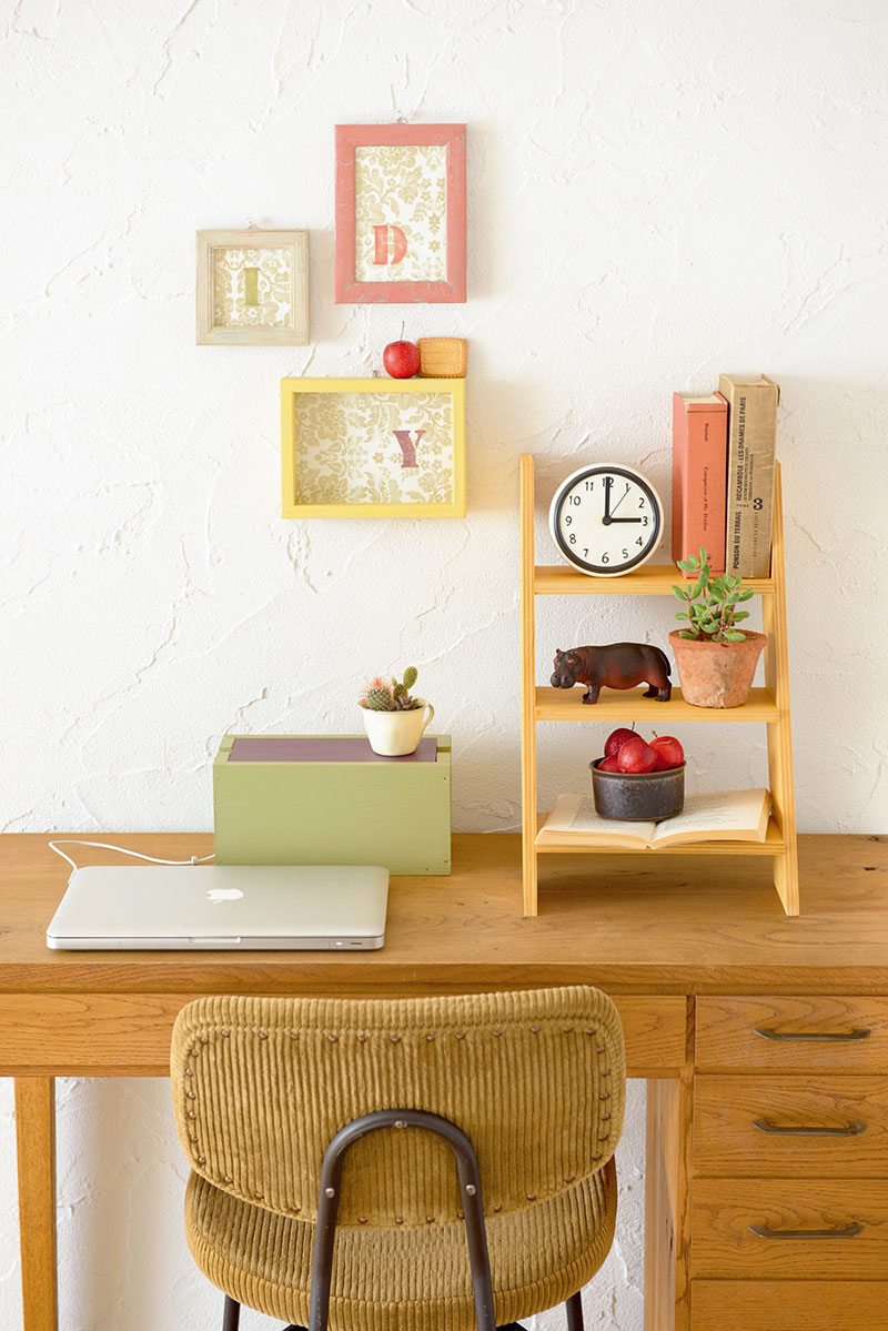 擺滿實用文具的書桌周圍如果不做點裝飾,就會像辦公桌一樣給人剛硬乏味的印象。使用繽紛的相框或小梯子點綴,增添溫暖的氣息,再將筆電等3C產品的電線藏在收納箱中,讓桌面看起來更加清爽。