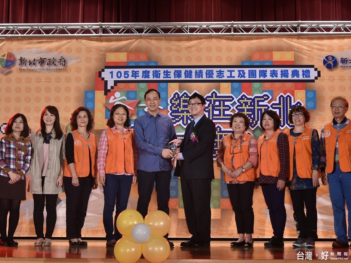 新北市政府衛生局為表揚衛生保健志工的付出,3日於市府6樓大禮堂舉行「樂在新北志高無上-105年度衛生保健績優志工及團隊表揚典禮」,朱立倫市長頒獎感謝每位志工為了生命及醫療的無私付出。