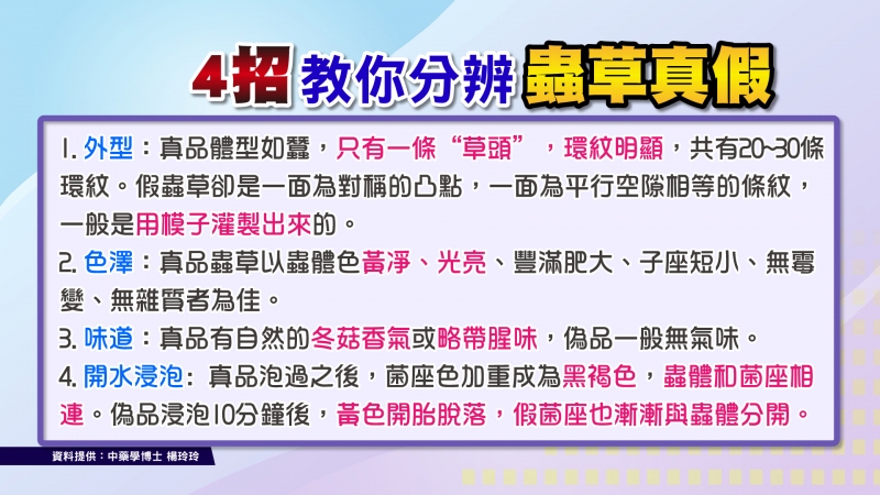 - 開水浸泡: 真蟲草用開水浸泡,蟲體變膨大而軟,菌座色加重成為黑褐色,蟲體和菌座緊相連,不脫落。浸液微有臭味。假蟲草用開水浸泡10分鐘後,會慢慢顯出原形,黃色開胎脫落,假菌座也開始脫落,與蟲體分開。