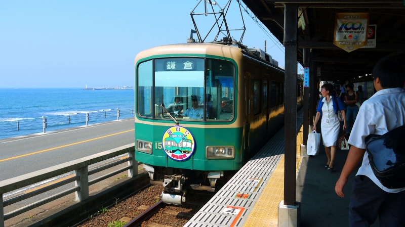 江之島電鐵在「鎌倉高校」站至「七里濱」站有臨海路段,可以感受海風的味道,尤其是「鎌倉高校」站,簡易式月臺直接面對相模灣,一下車就是海灘,候車時坐在椅子上,海景盡收眼底,非常浪漫,因此許多電視、動畫都會在鎌倉高校前站取景,讓本站爆紅,引起一股「朝聖」的熱潮,至今盛況空前。