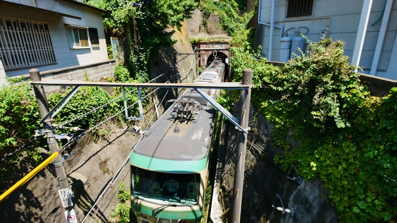 江之島電鐵在「極樂寺」站附近的路線,從海景換成了山景,也有全線唯一隧道「極樂洞」,充滿祕境之感,也難怪這條山海兼收的鐵道路會享譽盛名。「極樂寺」站本身就是「關東百選車站」,群樹下的木造站房,以及一座面對山壁的簡單月臺,周邊則是丘陵山區,具有山谷幽思的氛圍。車站附近的極樂寺,林木夾道而茂盛,古寺清靜無喧,適合一人至三人的小旅行。