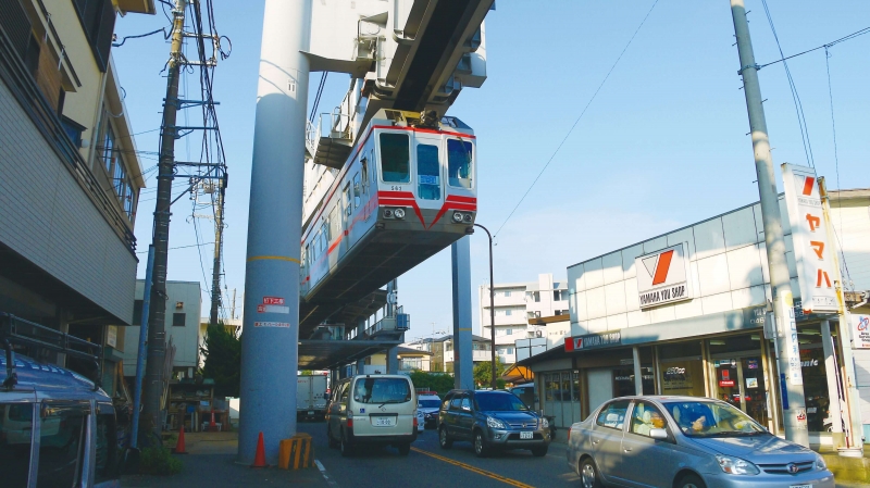 ▲江之島站旁的湘南電車,為少見的懸掛式單軌電車。圖片來源:時報出版提供