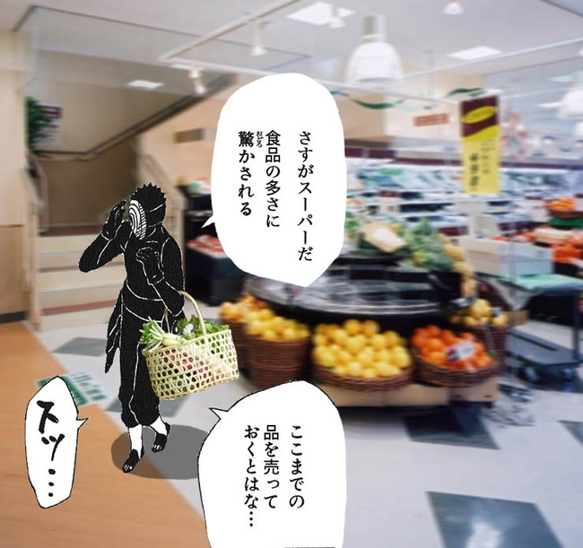 下圖:「真不愧是超市呀,被這麼多的食品給嚇著了呢。連這樣的東西都有賣啊...」