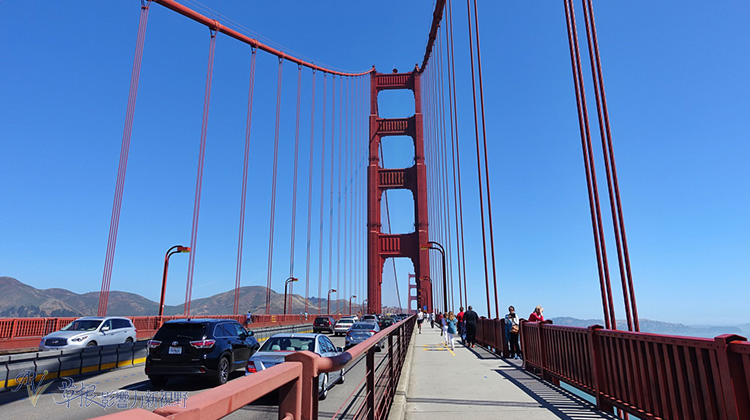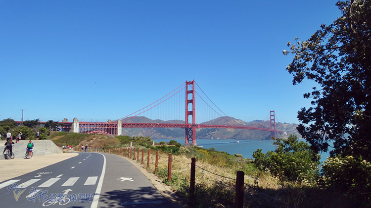 慢慢看到金門大橋,舊金山天龍國也貼心地闢出人行步道和腳踏車步道給你使用,車輛則得走另外一端的道路。