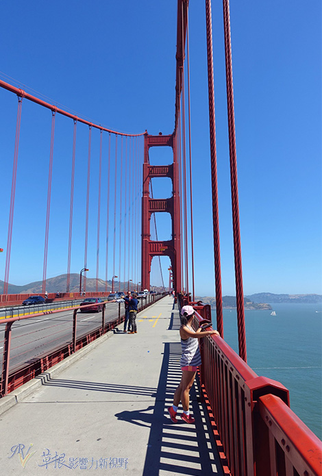 要用前面的人行當背景才知道有金門大橋有多雄偉,大約有227公尺高的大橋在你眼前,無比壯觀。