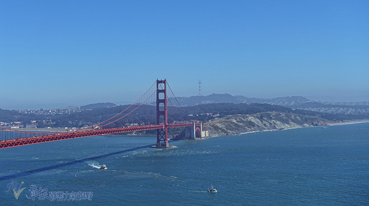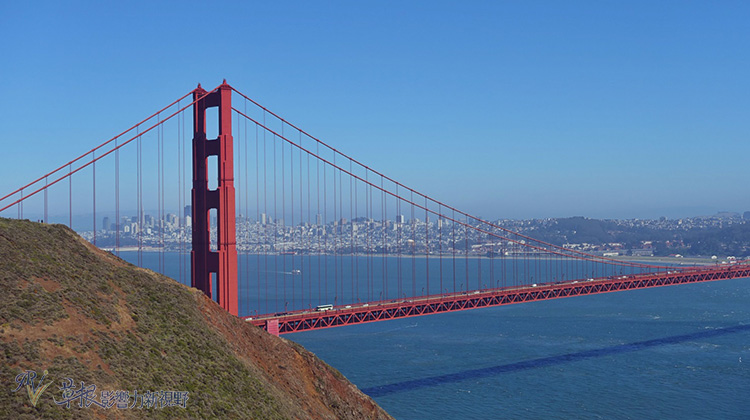 從下午的光線照過去的金門大橋,背後便是舊金山市區和天際線。每天估計有12萬輛車子行經過金門大橋。