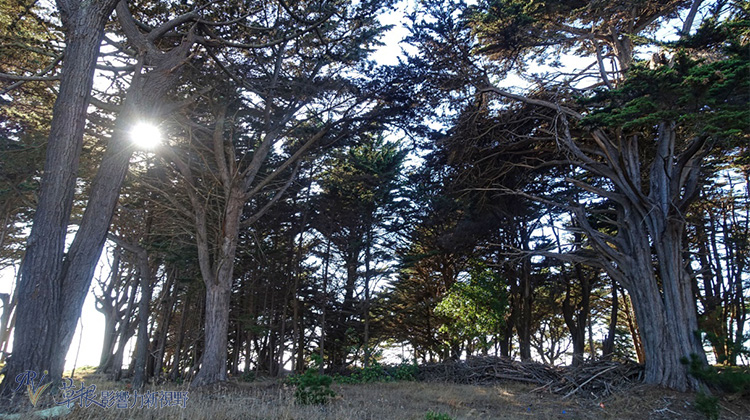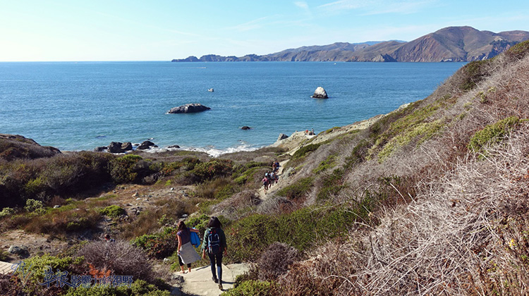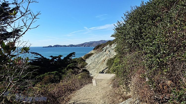 停車場前面一路往西慢慢走,在看到Batteries to Bluffs的標誌轉入,便可沿著鋪好的小路來到Marshall’s Beach。