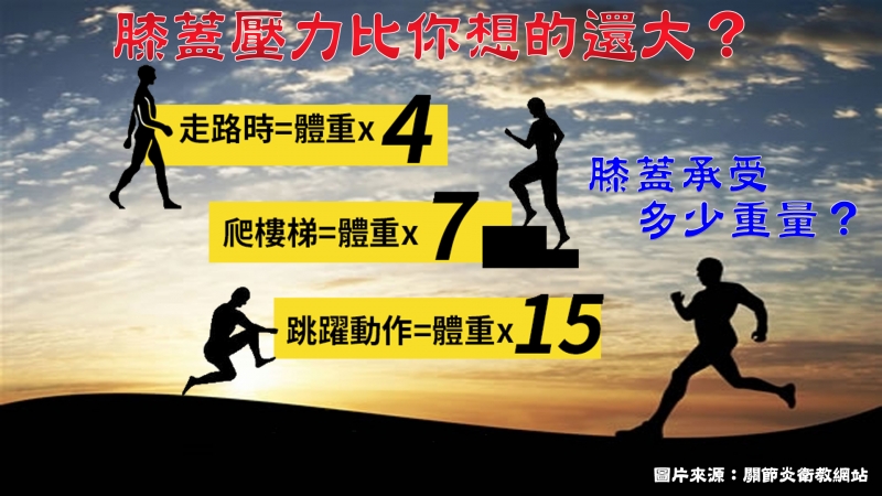 膝蓋是一個人體承受重量一個很大的重要關節,當走路時加在膝關節的壓力是體重的 3.5 倍,跑步時候是體重的 7 倍以上,所以膝關節、踝關節最容易出毛病。如果下面的腳踝不穩定,跟髖關節或骨盆的不穩定,也會影響到膝蓋,同樣的,膝蓋也會引發到臀、髖、腰、還有膝蓋、腳踝這些疼痛。