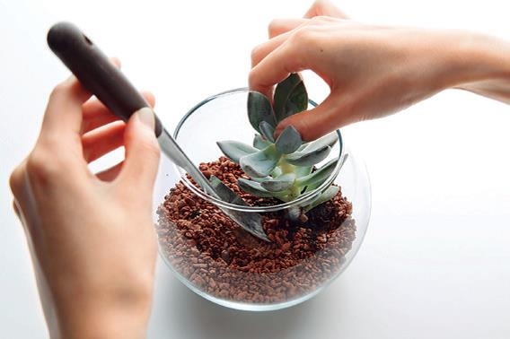 決定配置後,先從大型植物開始種植。使用鏟子或盛土器,將植物的根部埋入陶瓷顆粒土中,將植株固定。