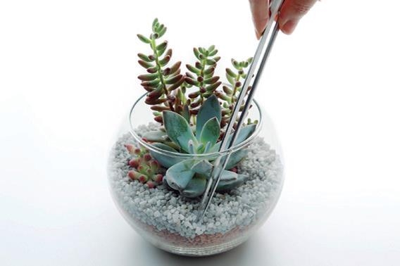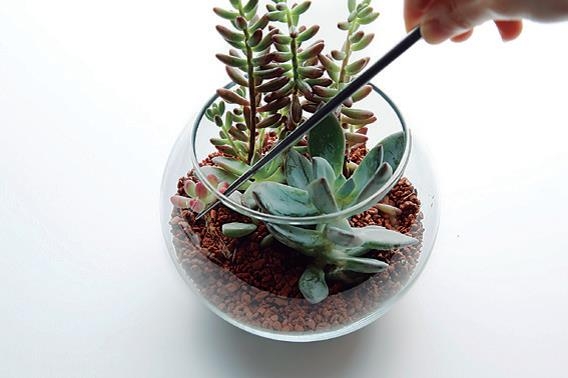 最後用鑷子調整碎石的比例、植物的位置,並將老舊葉子摘去就完成了。完成後別忘了澆水。