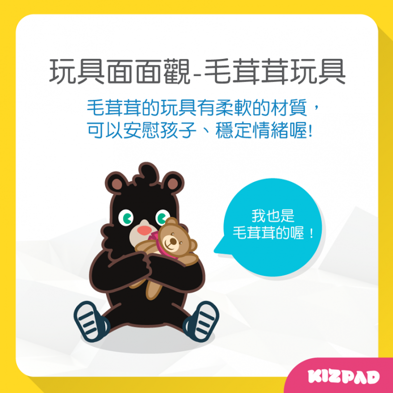 另外,毛茸茸的玩具有柔軟的質地,對於性格孤僻、膽小、渴望有關懷的孩子具有安慰、穩定情緒的作用喔。