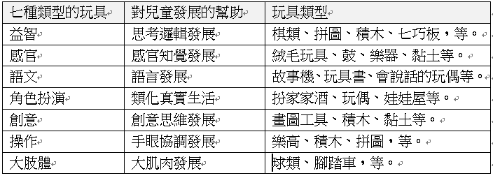 孩子在學習的階段中,從頭到腳都可以精心設計成玩具。目前,玩具可分為七種類型,而玩具須著重在孩子的主動參予,讓孩子有感覺到愉快的經驗,這才是玩具代表的真實意義喔!