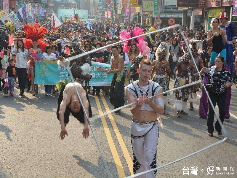 在中央噴水池舉辦的開場典禮中,特地邀請了法國極具影響力的「聖歐瑪市立管樂團」進行精采表演,他們為了充分融入台灣在地特色,特別練習了謝金燕的名曲「姐姐」作為演出曲目之一,讓現場觀眾倍感親切;而管樂節可不只管樂表演而已,現場也邀請到台灣馬戲文化的代表「FOCA福爾摩沙馬戲團」,以及結合森巴嘉年華特色的LUNA舞團等進行各式各樣的表演,在繽紛氣球萬空飄揚的開幕儀式下,以馬戲團作為前導,來自國內外42 支管樂隊開始了熱鬧的踩街,沿路嘉義市民隨著音樂或圍觀、或熱情參與,全程在冬日的陽光下顯得特別歡樂與活力。