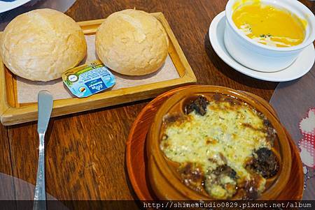 附贈的麵包 , 口感是屬於彈牙的類型 , 趁熱吃食還覺得滿軟不會硬硬的 , 真是合牙齒不好的人啊 ~