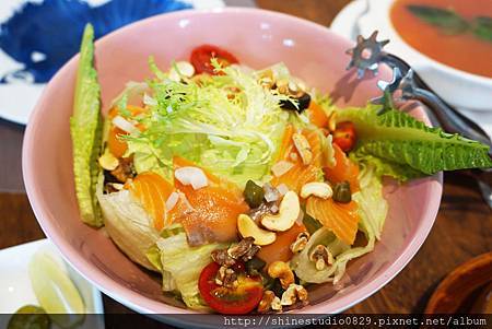 除了青脆的蔬菜 , 香濃的燻鮭魚淋上了清爽的檸檬隻和油醋也達到了提味的效果