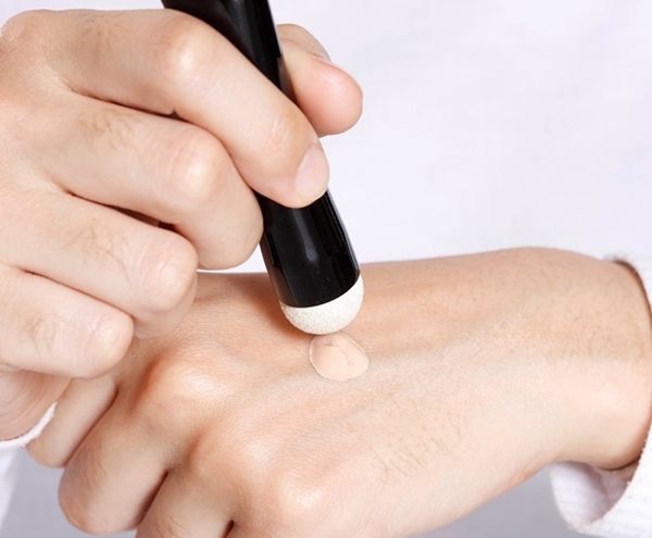 使用內附挖杓取出一顆珍珠大小量於手背上,再用刷具的海綿頭那端沾取適量後開始上妝。
