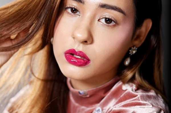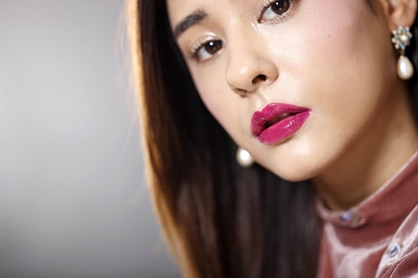 使用色澤相當飽滿的唇蜜,利用唇刷直接先勾勒出唇型,接著再均勻地塗抹上色,由於唇蜜的顯色度如同唇膏般,因此不需要再使用唇膏來打底。