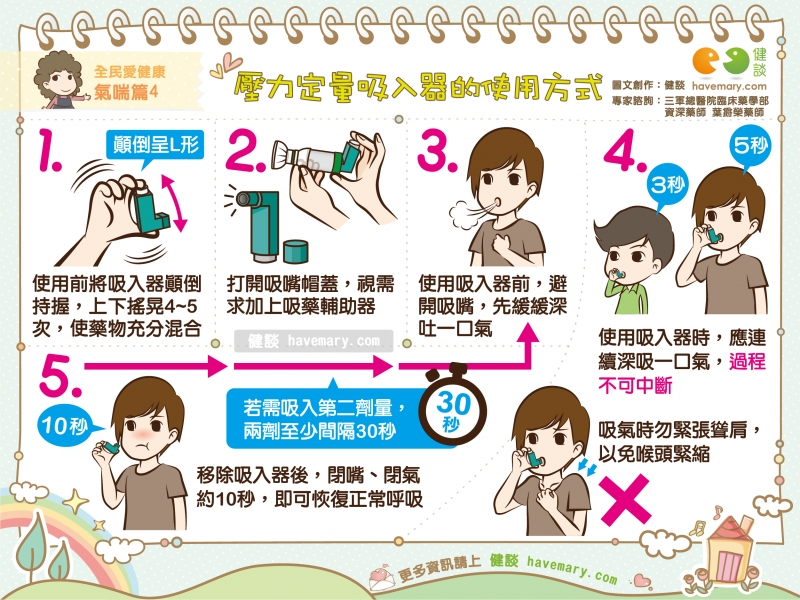 以氣喘或慢性肺阻塞患者最常使用的「壓力定量吸入器」而言,使用時建議可掌握以下幾個步驟: