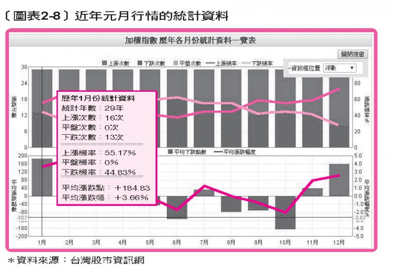 其次是許多公司會在元月發放獎金,獎金就是活水,也可能是行情的動力之一(見圖表 2-8)。