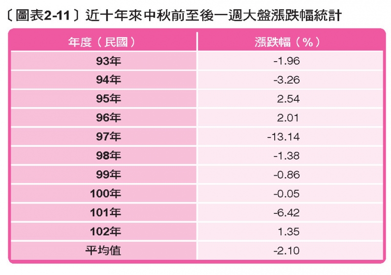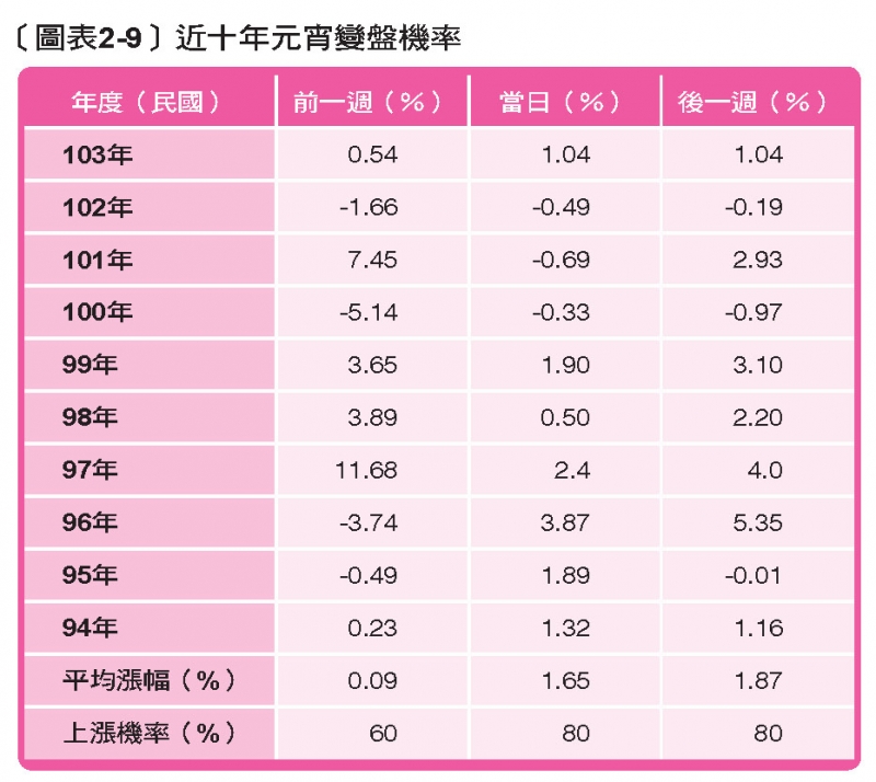 根據近年的統計,台股元宵前一週上漲機率為 60%,但在元宵節後一日及後一週上漲機率逾 8 成,平均漲幅則日益擴大,後一週平均上漲 1.87%,後一月更有 3.23% 漲幅,由此可知,台股在這個時間點往往是先蹲後跳,可從農曆春節效應一路旺至元宵節後(見圖表 2-9)。