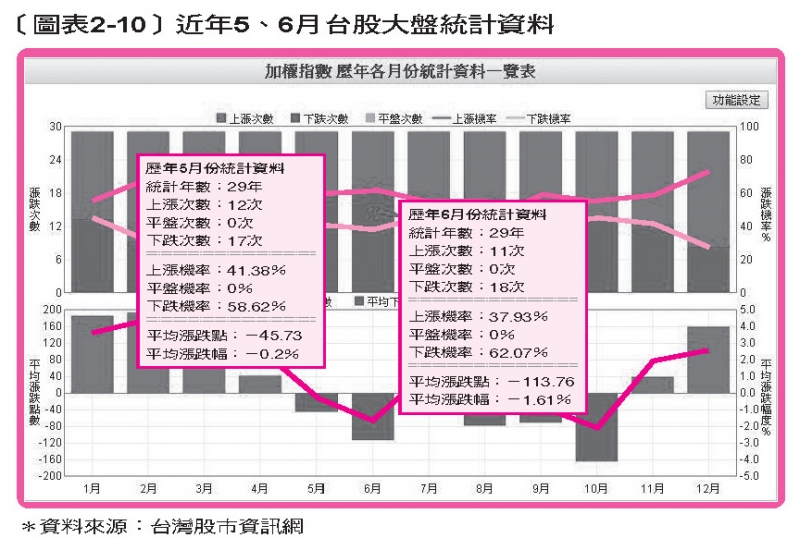 根據統計資料, 5、6 月下跌的機率的確比較高,何況買股票要關心的是個股,而不是指數,高殖利率的股票因為本質好,在董事會決定以後,通常熱度會持續上升,即使大盤直直落,也不太容易受到影響。所以,關於五窮六絕的說法聽聽就好(見圖表 2-10)。