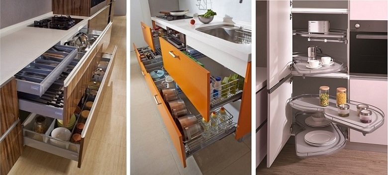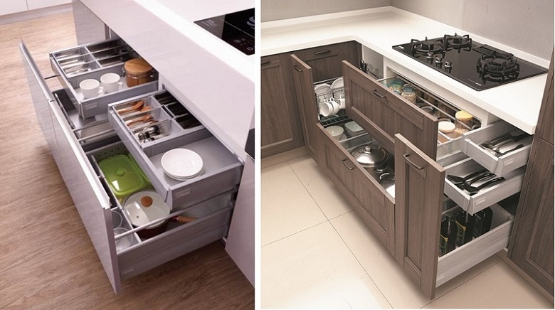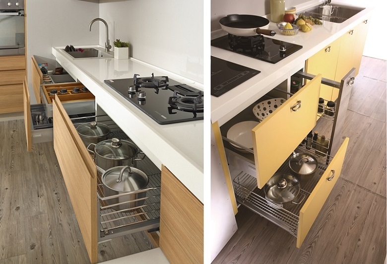 地櫃內亦能配置「籃類」五金,方便使用者收納各式碗盤或者調味罐,金屬組成的拉籃最大特性在於尺寸靈活與透氣瀝水性佳,大型圍籃與抽屜櫃一樣具緩衝開關功能,也是大型鍋碗瓢盆的收納幫手。