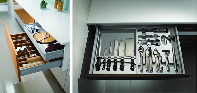 上半部則可再等分成兩個抽屜,以多樣的各式抽屜分隔器,作為刀筷叉匙與料理烘培小道具收納,將小物分門別類整齊放好,無論烹飪或備餐時,抽屜一開,馬上就能拿到,不再翻箱倒櫃,可以節省不少氣力!