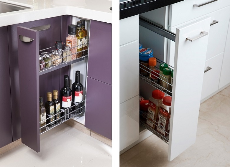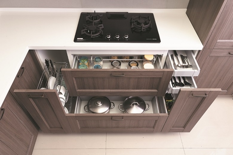 櫻花整體廚房為轉角規劃有蝴蝶轉盤、轉角連桿、轉角轉盤,最大特點是櫃門打開後,藉由精密的結構連動拉推,收藏在內部轉盤與籃架可以完全推出展開,收納物品一覽無疑,一些整套杯組、保鮮盒雖非每天使用,但卻是不可缺少的料理物件最適合收納在轉角櫃裡,也將地櫃的區域運用發揮極致,不留一寸無用空間。