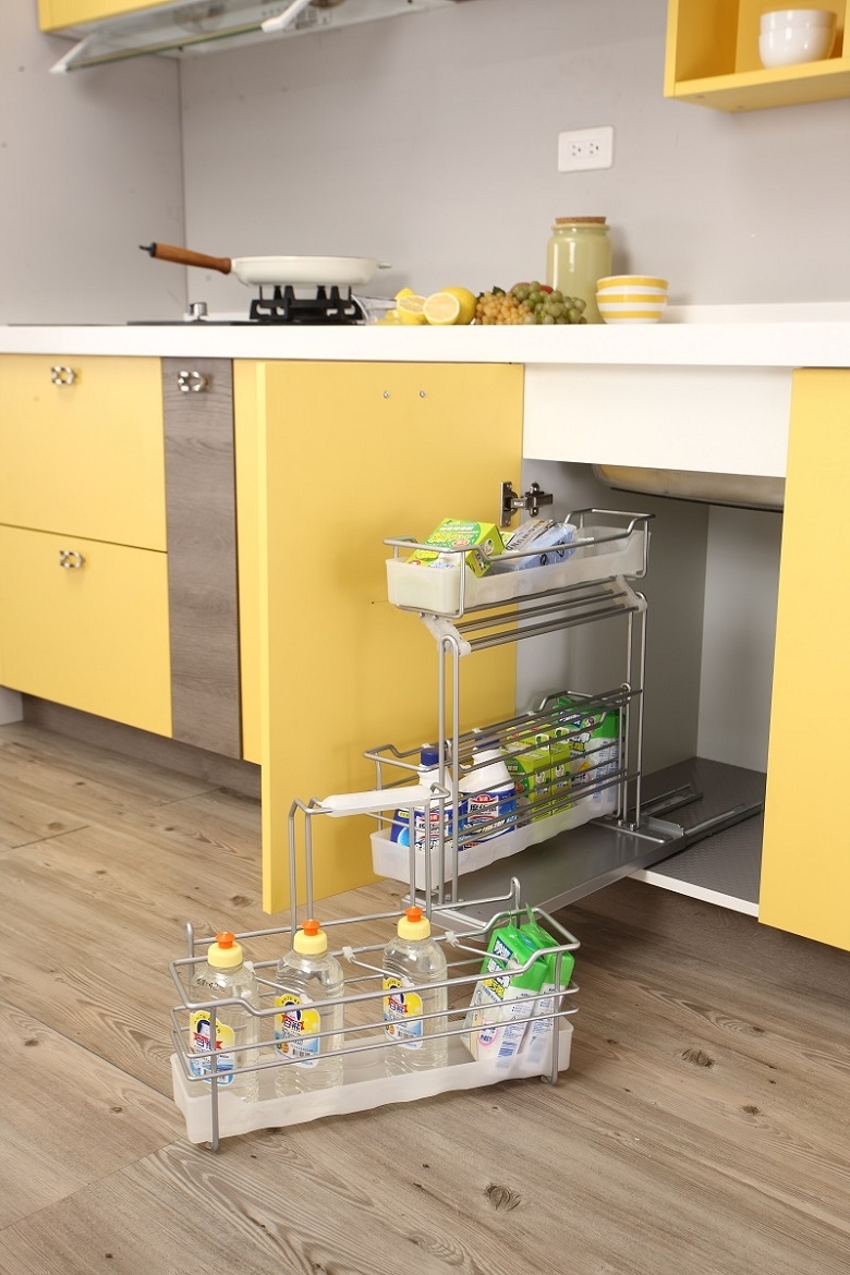 總是讓人煩惱該放哪的清潔道具,水槽下方專用的清潔拉籃,搭配全展式滑軌靜音緩衝裝置,再加上附把手設計的提籃,可任意提取移動洗劑與菜瓜布,暫放檯面上待用完後再放回,讓媽媽主婦們大呼方便!