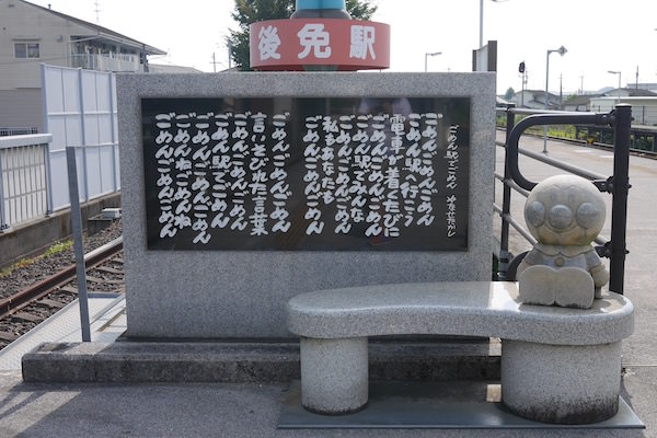 車站月台上還有麵包超人作者柳瀨嵩老師所做的詩,題名「ごめん駅でごめん」。