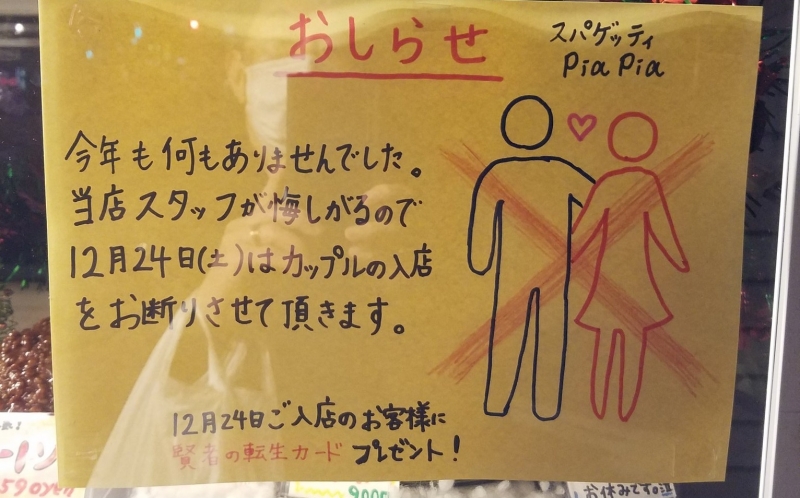 「今年也是甚麼也沒有的一年。為了本店員工痛苦的心情,12月24日(六)禁止情侶入店。」下面還有一兩行小字:「12/24來店的客人將贈送『賢者的轉生卡』!」