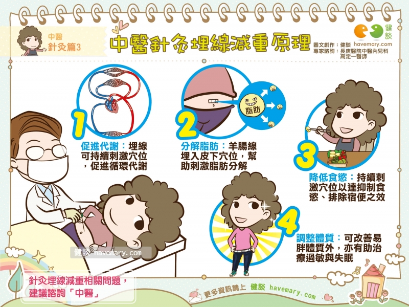 1. 促進代謝:中醫針灸埋線療法是將羊腸線埋入皮下的穴位中,藉由持續刺激經絡穴道而達到促進氣血循環與新陳代謝的效果。