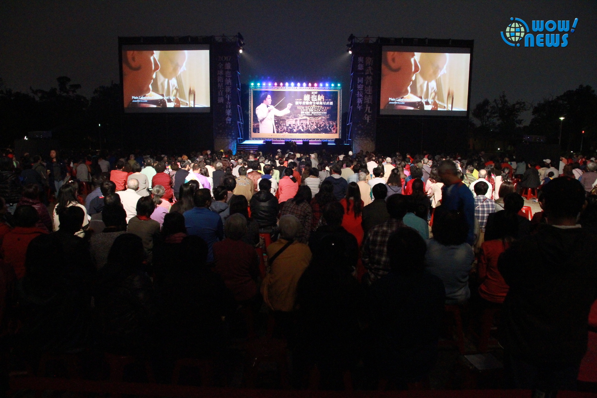 2017新年第一天高雄天氣晴朗炎熱,晚上涼風徐徐令人心曠神怡,傍晚開始湧現人潮,許多民眾攜家帶眷前往衛武營,不少人更帶野餐墊和小椅子席地而坐。各界引頸期盼落成的衛武營國家藝術文化中心,已逐漸進入工程尾聲,為了讓民眾能逐步親近這座與周圍綠意巧妙結合的文化基地,於1月1日起,文化部衛武營藝術文化中心籌備處,將圍籬向後退縮,提供主建築週邊室外空間供民眾散心休憩,可近距離欣賞沿途公共藝術及主體建物之美。下午4點起由榮獲去年金曲獎最佳演唱組合獎的「張三李四」演唱一小時進行暖場,實力精采演出搏得熱烈掌聲。晚上6點,衛武營戶外園區數千座位座無虛席,第三次搭檔主持默契絕佳的大提琴家張正傑和台視主播鄔凱雯受到民眾熱情歡迎,張正傑拿出手機和鄔凱雯及數千名觀眾自拍合照,他表示:「台灣是全世界獨一無二戶外轉播維也納新年音樂會的地方,立即把照片傳給維也納愛樂管弦樂團看看今天的盛況。」