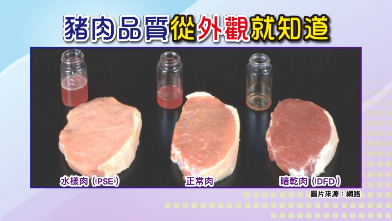 ◎ DFD肉(dark firm dry pork),又稱為暗乾肉,其特性則是色澤深暗、肉質偏硬及表面乾燥,發生原因主要是因為豬隻在屠宰前受到長期性的緊迫,而使的肌肉中的肝醣消耗殆盡,無法在屠宰後產生適量乳酸,將肌肉的pH值降至正常值所導致的。