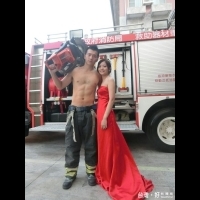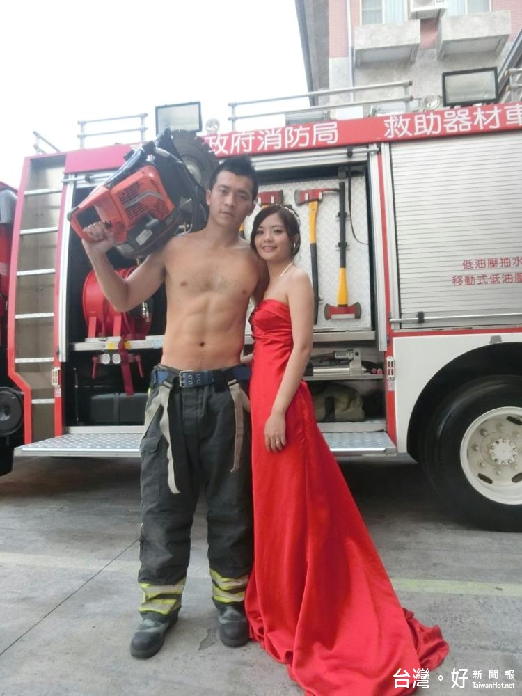 嘉義市政府消防局第一分隊隊員林富山,2年前因參加馬拉松而認識與小他5歲的衛生福利部新營分院跟診助理女友蘇小姐,兩人雖然休假時間不同,但彼此能互相體諒,相知相惜相戀相愛,今年更互許終生,特地於訂婚這天選在第一分隊拍攝另類婚紗照,為人生重要時刻留下特別回憶。
