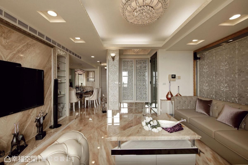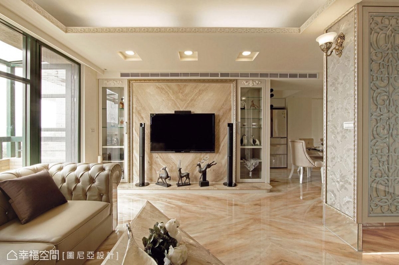 透過大理石材的堆砌、藝術線框的包覆與立體雕飾,譜出具有新古典質韻的奢華美學。