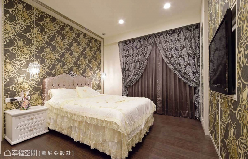主臥牆面以造型華美的進口圖騰壁紙,呼應窗簾與電視牆的元素,鋪述一種獨特的美感況味。