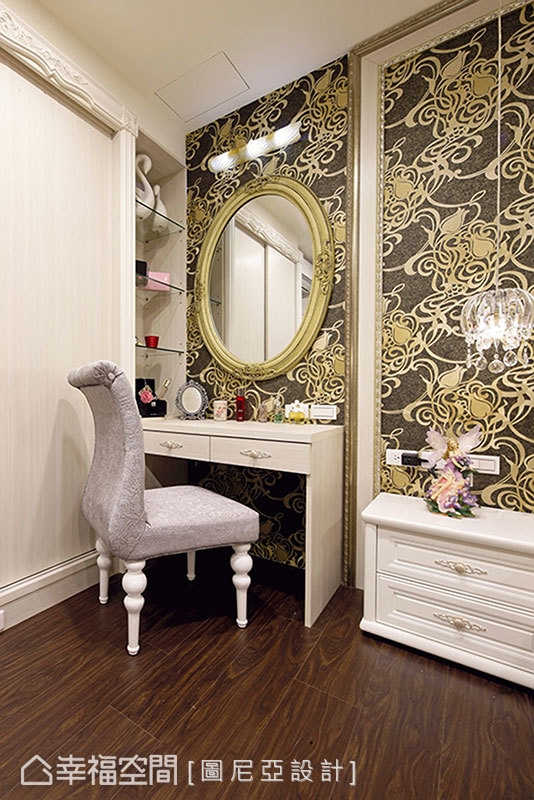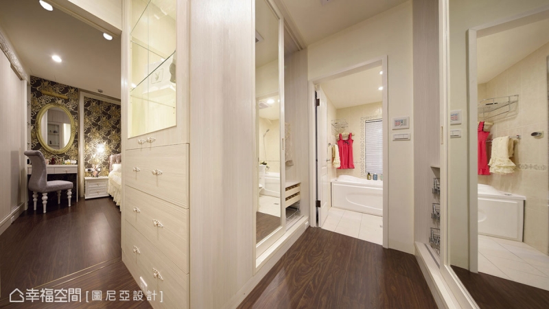 藝術造型的典雅鏡框,與左側的置物層板,滿足女主人的期待,是機能與美感兼具的貼心設計。