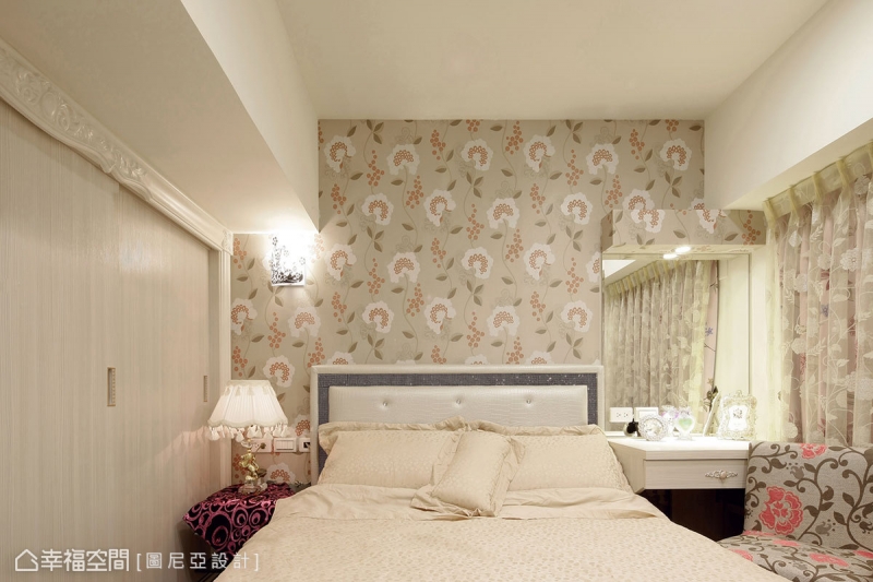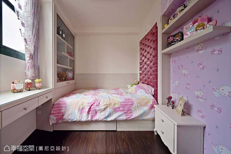 以粉色浪漫為主調,運用在床頭與壁紙的設計上,打造出女孩所喜歡的小小公主風。