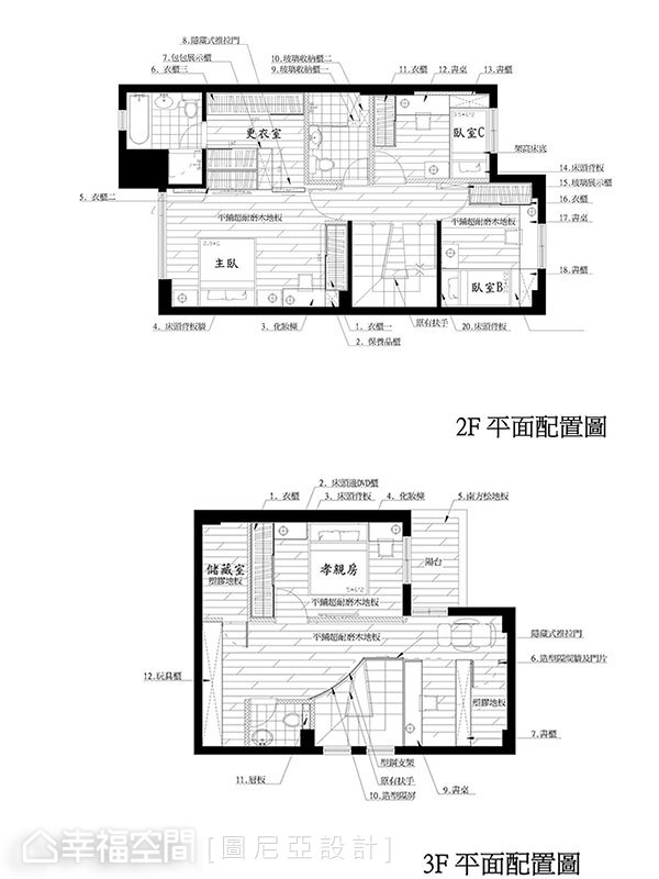 位於三樓的長親房,同樣走奢華與古典風,並利用上方的壓樑位置設置收納衣櫃。