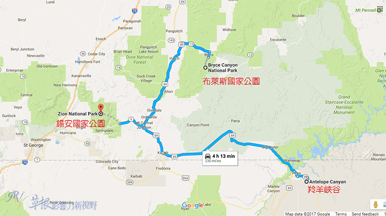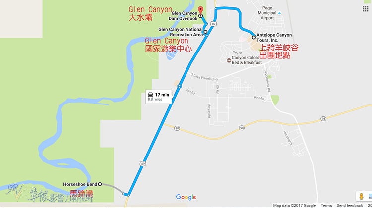 列出今天介紹的三個景點,距離羚羊峽谷都是十分鐘以內的車程。雖說馬蹄灣和大水壩都是隸屬於Glen Canyon國家遊樂中心,但只有Glen Canyon區域裡面需要收費(若有美國國家公園的年票則可免費參觀,不需要額外付費),馬蹄灣和水壩則是免費參觀。