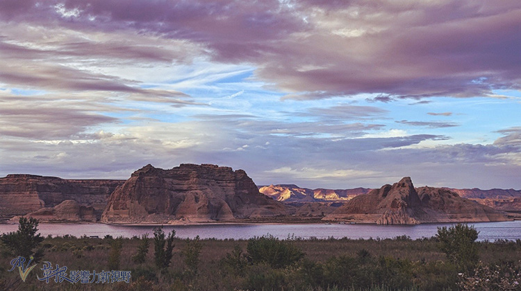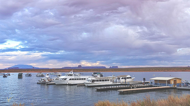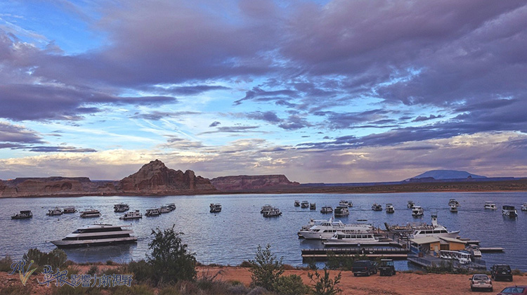 繼續往前,雖說這時已經夕陽西下,但我們還是來到水壩旁邊的鮑爾湖(這裡面便是要收費才能參觀的地點)來欣賞夕陽的餘暉。鮑爾湖命名來自於約翰鮑爾John Powell,也是美西拓荒史上,第一位探索大峽谷內的科羅拉多河流域的人。