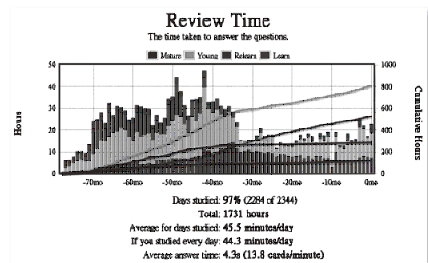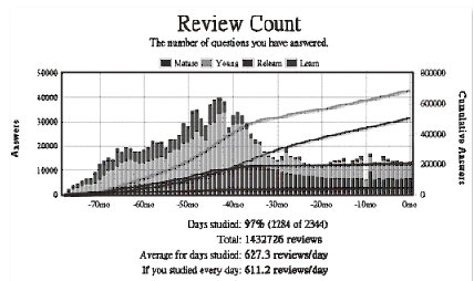 我從大一下(2009 年 3 月)開始使用 Anki,使用到 2015 年 8 月已經建立超過四萬三千多張卡片,2344 天裡我有 2284 天使用 Anki 來學習,只有 60 天沒有使用。在這 2284 天內,我一共學習了超過一百四十萬張(1,432,726)卡片,平均一天學習 627 張。在這 2284 天內,我學習總時數超過 1731 小時, 平均一天花費 45.5分鐘。