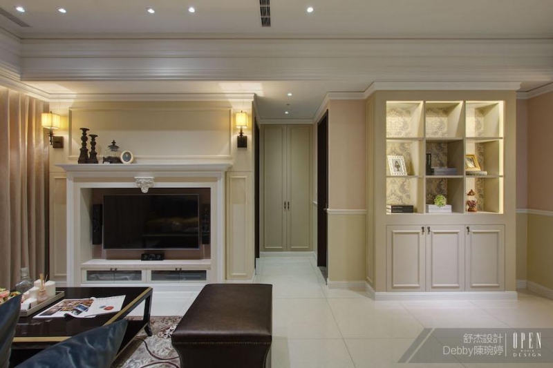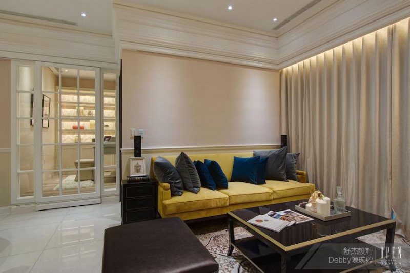 一踏進客廳空間,黃藍色的沙發搭配與粉色主題呈現強烈對比,在優雅中似乎還有一點沈穩與安靜。電視櫃的壁爐設計讓人誤以為進入法國鄉村,家具的線條設計達到完美的一致性,讓人在視覺上有舒服的感覺。