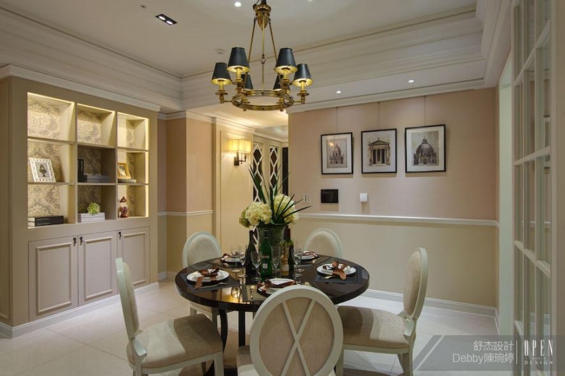 粉色的餐廳空間,最吸引人目光的莫過於那盞黑黃色系的垂燈,大幅增加空間的古典氛圍,小圓桌成功塑造家人團員的溫馨,那股淡淡的法式恬靜,在每個角落裡輕輕飄散。