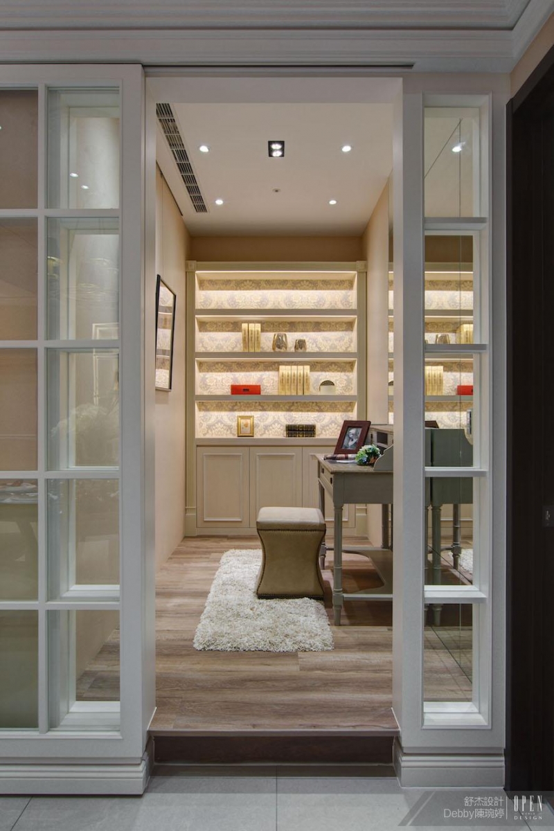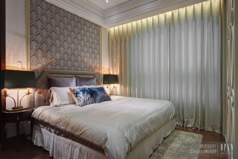 設計師特別為屋主打造一間小而巧的書房,除了有每個女孩都需要的梳妝台以外,旁邊的書架更增添屋主的文藝氣質,讓人願意坐在房裡,抱著享受閱讀帶來的喜悅。臥房內,床頭的壁紙和床尾的浮雕互相映襯,線條美感讓法式風格的優雅再次瀰漫在空間內。
