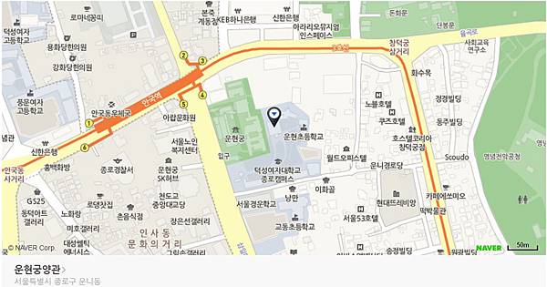 會先看到雲峴宮的韓館,正後方就是了