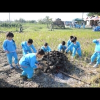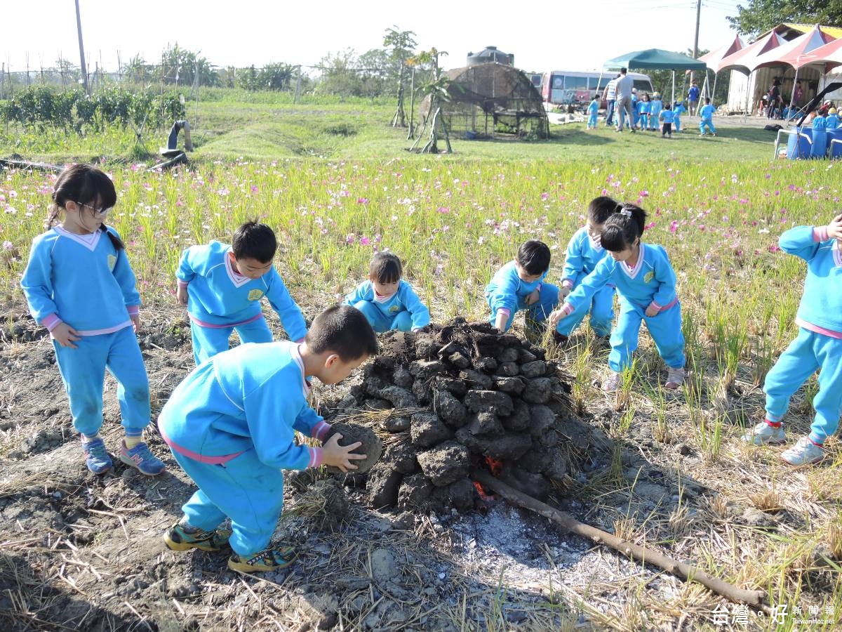 焢窯是傳統農家收割後的特色活動,明道大學附設幼兒園充分利用大學資源,讓幼兒園小朋友可以在整個大學校區追趕跑跳碰, 7公頃的有機農場也成為小朋友田野體驗的最佳場所,隨著稻作收割,19日由精農系大學生帶著小朋友一起堆土窯、烤地瓜,玩得不亦樂乎。