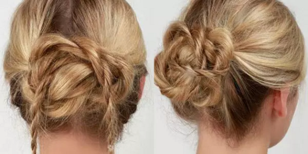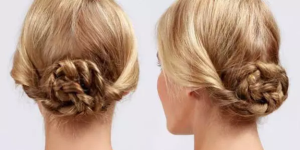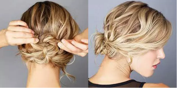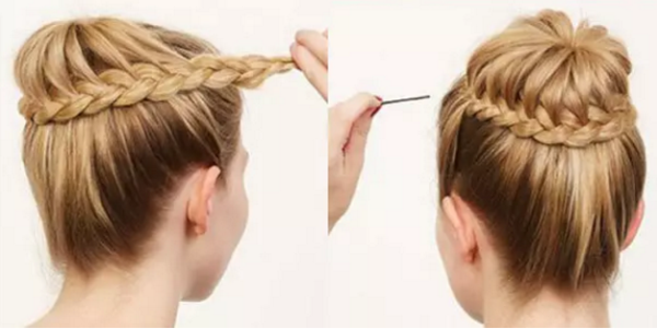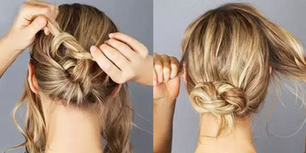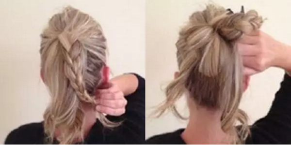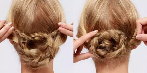 將旋轉一周的編織髮辮尾端藏進髮包中
