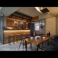 幸福夢工廠工作即是享受,本案以Loft風的咖啡廳為設計主題,規劃位於辦公區內的茶水間,提供員工最舒適的休憩環境。空間溫度設計師郁琇琇使用木地板作為吧檯立面質材,搭配上後方的木質櫃面與文化石牆面,從視覺到觸感都盈滿著空間的溫度。創意想像工業風的率性元素結合大膽的現代語彙,並以黑板漆塗抹窗旁的樑柱量體,激發員工無限的創意想像。